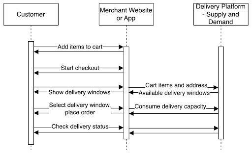 Each e-commerce website or app has three primary call patterns into our delivery platform: Checkout: Query available delivery windows and prices, providing the cart contents, pick-up address(es), and delivery address. Order Submission: Submit the order to the delivery platform after checkout and payment. Post-Checkout: View the order’s delivery status and ETA.